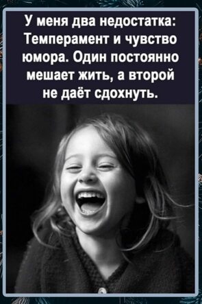 Сразу скажу, что у меня 2 недостатка: темперамент и чувство юмора. Один из них немного мешает,а второй не даёт сдохнуть!)3НравитсяНет